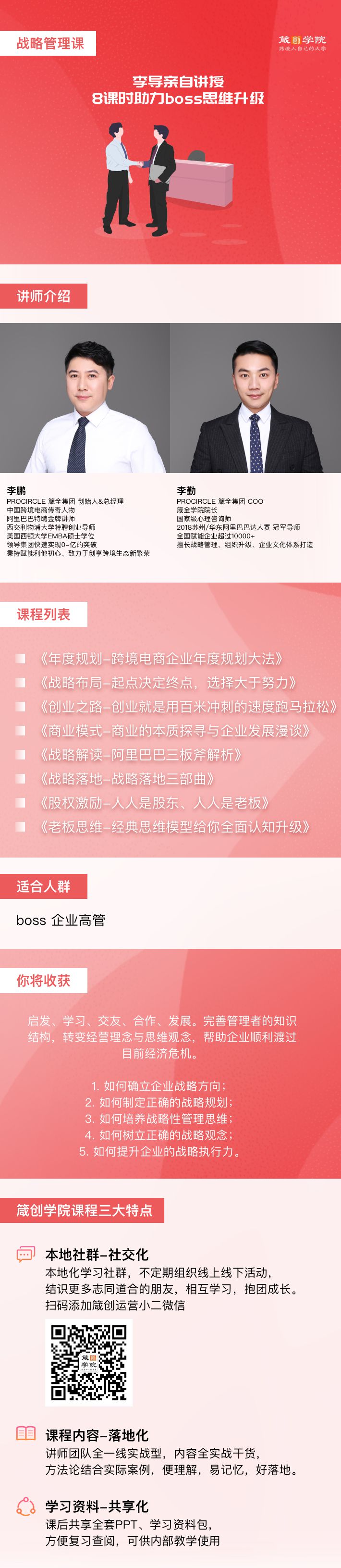 启发、学习、交友、合作、发展。完善管理者的知识结构,转变经营理念与思维观念,帮助企业顺利渡过目前经济危机。1. 如何确立企业战略方向;2. 如何制定正确的战略规划;3. 如何培养战略性管理思维;4. 如何树立正确的战略观念;5. 如何提升企业的战略执行力。